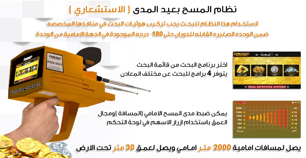 نظام MEGA GOLD المتطور بنظام المسح و الاستكشاف بعيد المدى من خلال المستشعرات الإلكترونية عالية الدقة وحساسات متطورة مصنعة لأول مرة ، إضافة لتزويد الوحدة الإلكترونية في الجهاز بـ 8 فلاتر مصنعة من الذهب الخالص لتحديد معدن الذهب من أبعد المسافات وتاكيدها بنسبة 100% دون حدوث اي خطأ ناتج عن صخور معدنية أو أراضي ذات تمعدن عالي مثل الأراضي البازلتية شديدة التمعدن .